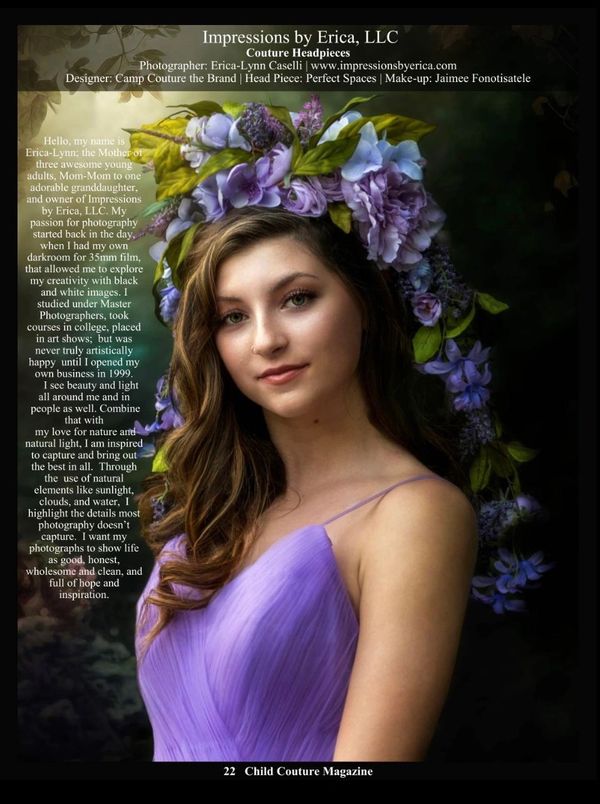 Impressions by Erica, has had the honor of being Child Couture Magazine's Top 10 Tween Dream Photographer of the Year for 2024-2025. For the past three years, she has been featured in several issues of both the upscale Child Couture Magazine and Teen Couture Magazine.